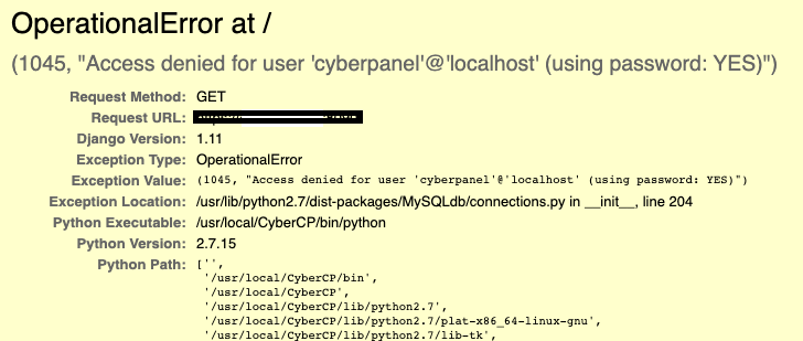 Eğer hata almaya devam ediyorsanız, mysql servisinize root olarak bağlanıp “cyberpanel” kullanıcısının şifresini değiştirip, yukarıda belirtilen settings.py dosyasına yapıştırın.